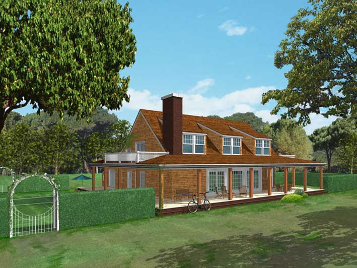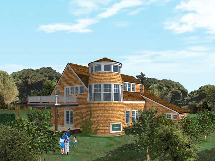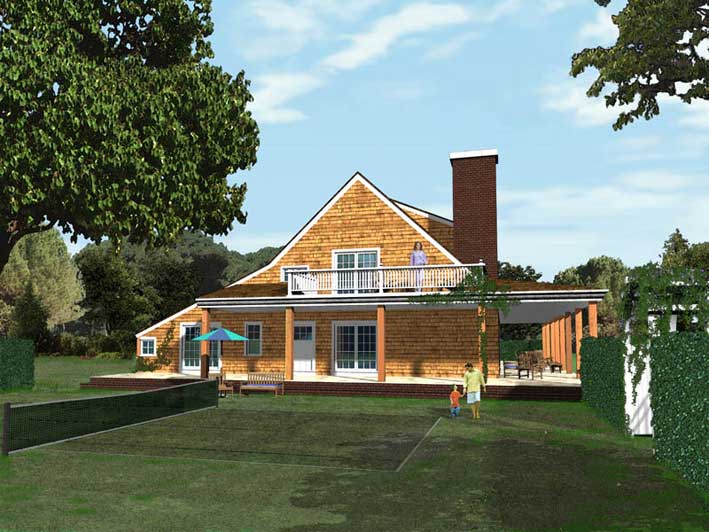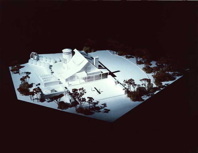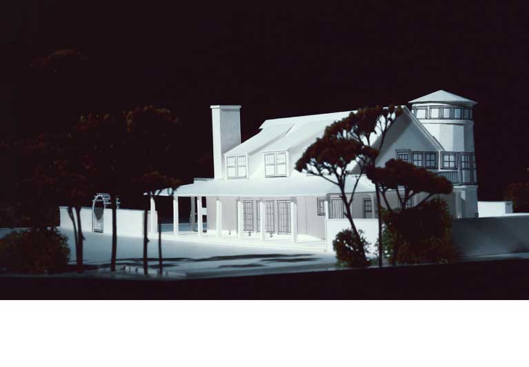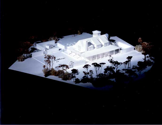 The house is distinguished by sweeping porches accentuating the open plan of the house, as well as by the tower element which mediates between the orientation of the house, determined by maximum exposure to light and views, and the location of the house on a cul-de-sac.