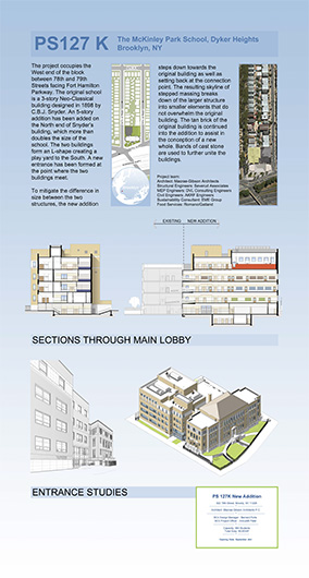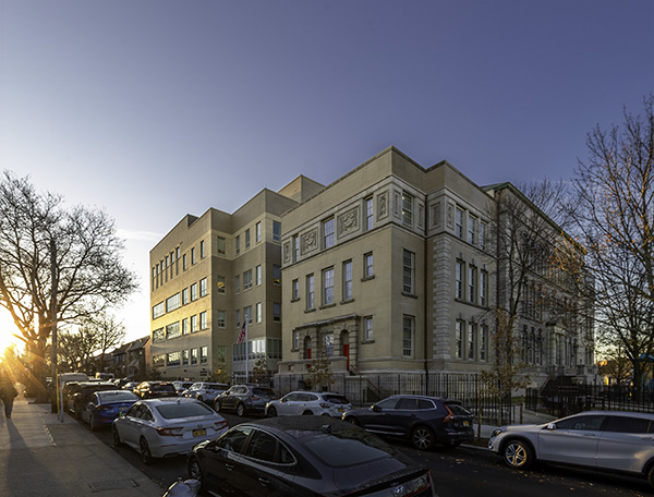 SiteThe site is occupied by an original Neo-Classical school designed in 1898 by C.B.J. Snyder. This edifice is a striking example of early New York school construction and contains three stories of tan brick and limestone, sitting on a limestone base containing a basement situated half a level below grade. An addition has been added the original building connected on the North end, which more than doubles the size of the school. The addition was opened in the fall of 2021.