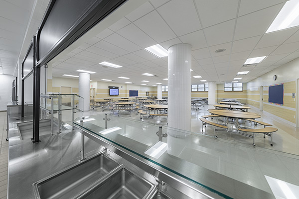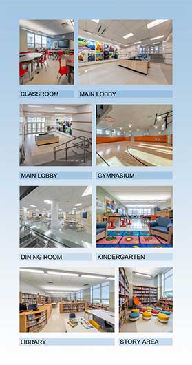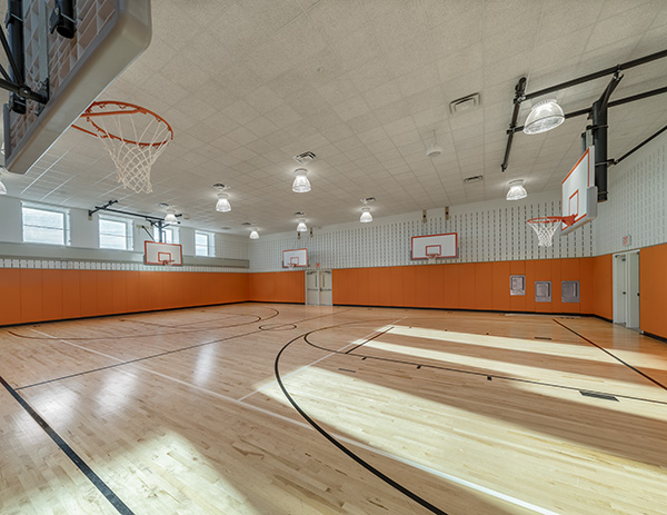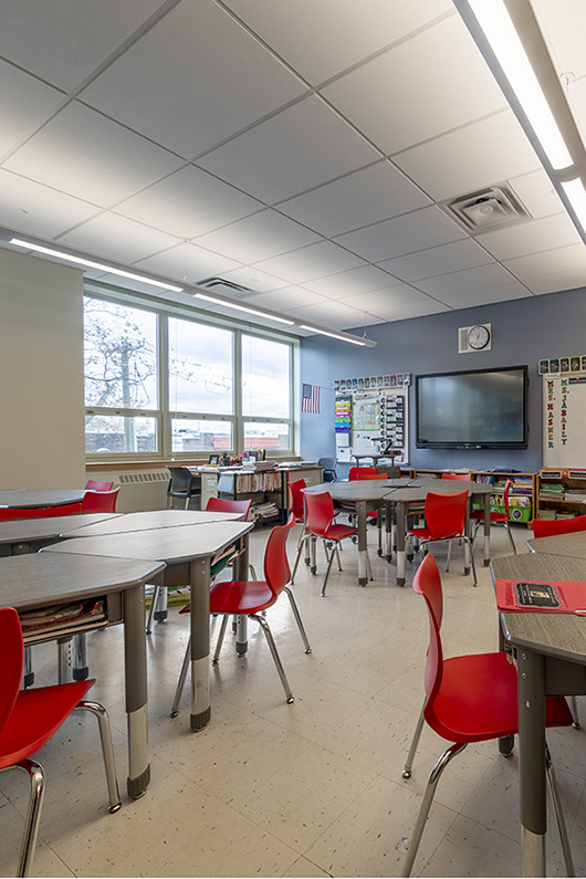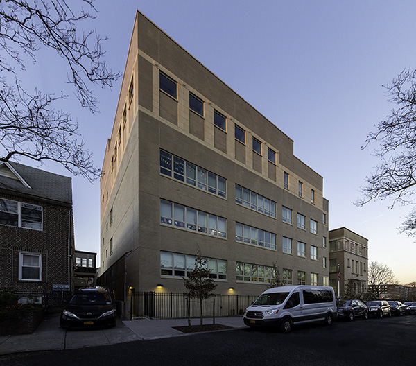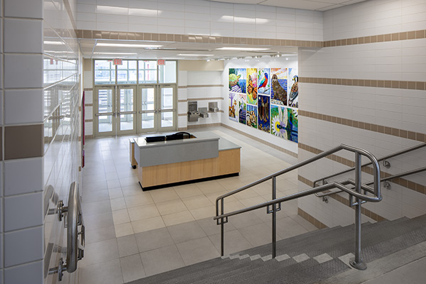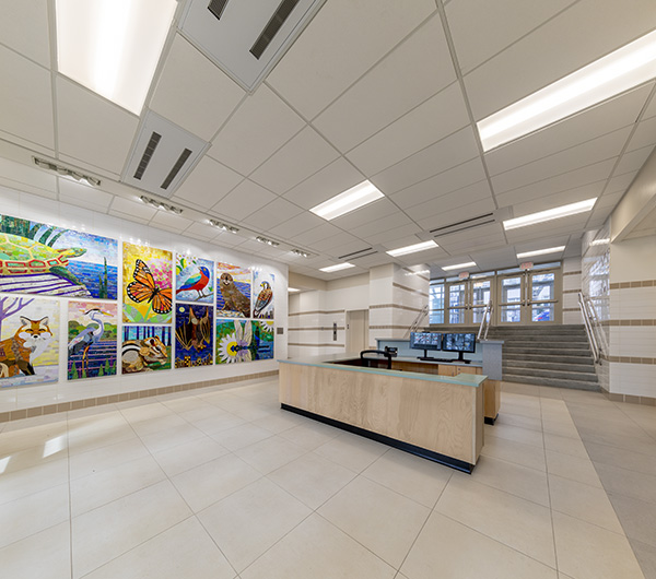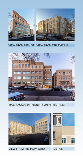 The original school was entered from the Parkway side by means of a tall double flight of steps leading to the First floor. The addition forms at L-shape with the original building running along the North side of the site on 78th Street. The remaining space to the South side of the addition forms the play yard. A new entrance has been formed at the point where the two buildings meet, easily visible from the corner of 78th Street and the parkway. This entry gives an accessible main entrance to both building from a new lobby accessed via a half fight of steps down to the basement level. Elevators provide access to all levels of both buildings from the entrance.