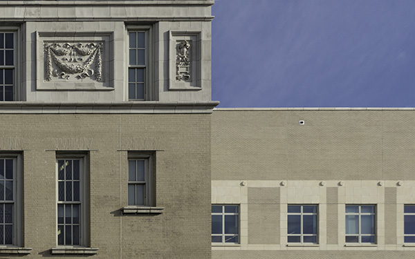 Treatment The tan brick of the original building is continued into the addition to assist in the conception of a new whole. The broad limestone band that binds together the top floor of the original building is continued in the addition in cast stone, accommodating itself to the varied heights of windows resulting from the gymnasium and other top floor spaces. The highly ornamental three dimensionality of the original limestone façade plaques and wreaths is referred to in restrained roundels along the top of the bading that runs around the addition.