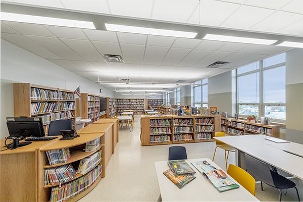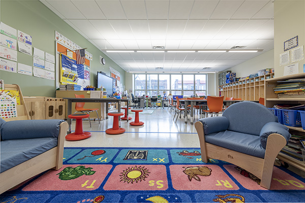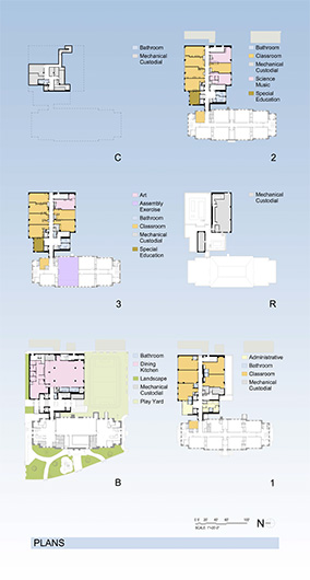The new addition is significantly larger in area than the original building, as well as being a full story higher. To mitigate the difference in size from the main entry, the new addition steps down towards the original building as well as setting back at the connection point. The resulting skyline of stepped massing breaks down of the larger structure into smaller elements that do not overwhelm the original building. On the South façade, facing the play yard, the new addition is separated from the original at the play yard entrance. This permits the two volumes to enter into a dialogue with each other, the new taller, but the original longer. The placement of the new addition allows the original stepping of façade planes in the historic structure to build to a conclusion in the addition.
