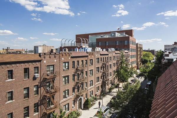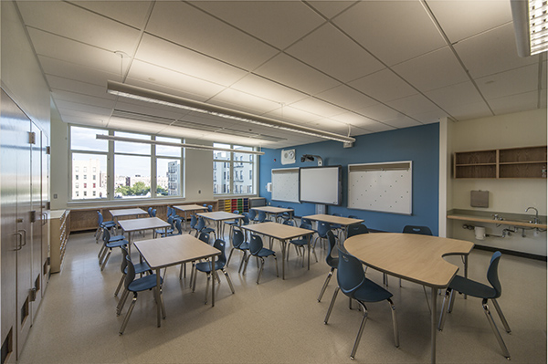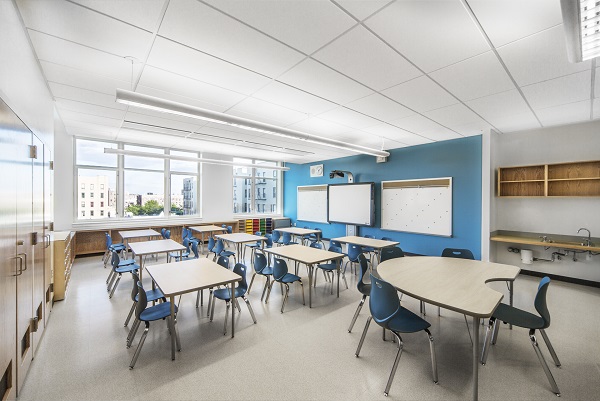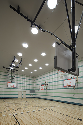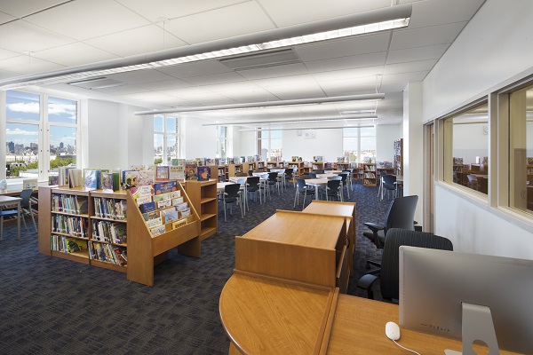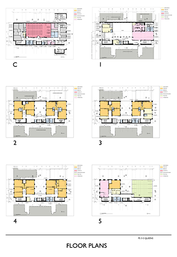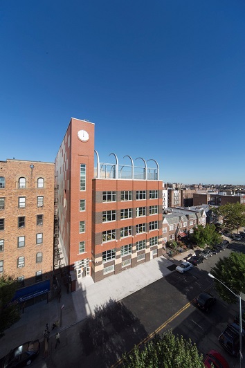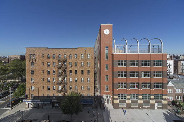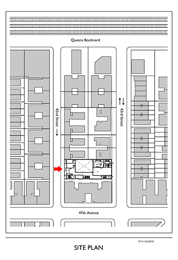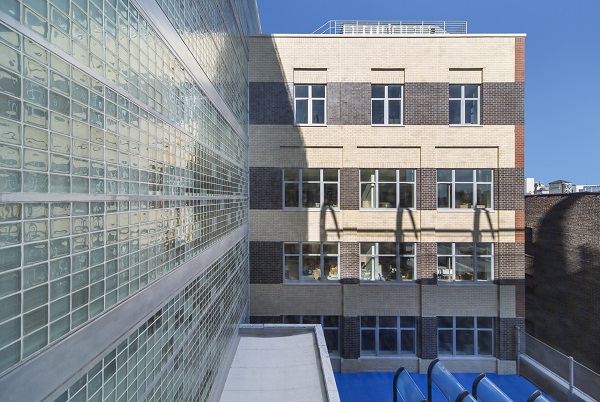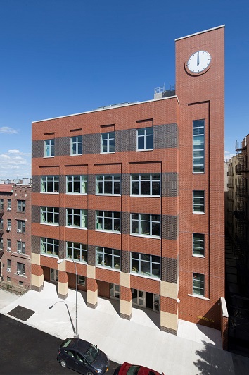 The project is located one block South of the elevated #7 subway line in the Sunnyside neighborhood. The area is a residential community of densely packed red brick buildings, usually five stories high, and seven stories on larger streets, with some smaller single family houses. The project occupies a through-block lot between 42nd and 43rd streets which slopes approximately ten feet to 43rd. The site opens towards the North onto the mid-block court, which is clear all the way to the subway tracks at Queens Boulevard and beyond, providing views through the otherwise dense urban fabric. Circulation and Entry Circulation within the building is orientated East West, and early designs studied different ways to manage this circulation artery through the building. It was decided to locate the main entrance on 42nd street because this would use the slope of the site to maximum advantage, both for cost and program efficiency. The placement of the elevators was organized so that the mid-court view would be seen from the main circulation corridor across from the elevators, thus admitting light into the center of the building. Building Massing It became apparent that the circulation could be expressed as two long horizontal masses, one in brick and the other in glass brick. Early axonometric studies investigated the contrast of these horizontal blocks of mass and their contrasting materials. Stairs and elevators are contained in the brick mass, and circulation in the shorter glass mass. The program area was arranged in two cubic forms balanced at either end of these bars, forming an Early Childhood play area between them. The taller block is five stories high and contains entry and administration on the first floor, classrooms on the floor above and the library on the top floor. The smaller block contains the dining room and kitchen on the ground floor, with classrooms above and an enclosed play yard on the roof. The roof cage is a cable structure, supported from steel stanchions, with stainless steel mesh. The gymatorium occupies the majority of the cellar level, and is visible from the entry level by means of clerestory windows. Facade Treatment The general context of the project consists of brick buildings of the early 20th century, including a large number of buildings from the 1920s. While maintaining a continuity of scale and materials with these buildings, elevation studies explored ways to differentiate the building and develop an iconic appearance for it. It was determined that the circulation massing could be expressed as a clock tower, and that open arcades and other treatments of the base could welcome the public at the street level, while special spaces on the top floors could develop a unique skyline and profile. Project Team Architect: Macrae-Gibson Architects Structural Engineering: Severud Associates MEP Engineering: DVL Consulting Engineers Civil Engineering: Langan Engineering Acoustic Engineering:Cerami Associates Food Services: Romano/ Gatland Vertical Tansportation: Savcom Engineering Environmental Transportation: TRC Engineers Sustainability Consult: Viridian Energy & Environmental, LLC.