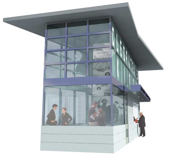 The overall form of the building is ship-like. The long thin form is designed to evoke the memory of Commander Coakley’s little ships which did their bit to evacuate over 300,000 allied soldiers from certain death by the Nazis on the beaches of Dunkirk in 1940. The festive air of the kiosk with its patriotic paraphernalia is tempered and given a depth of meaning by the viewing area with its wheel-house location immediately above the waters. The overall style of the building refers to the modernist architecture of that period, but is tempered by a critique of its excessive Rationalism.