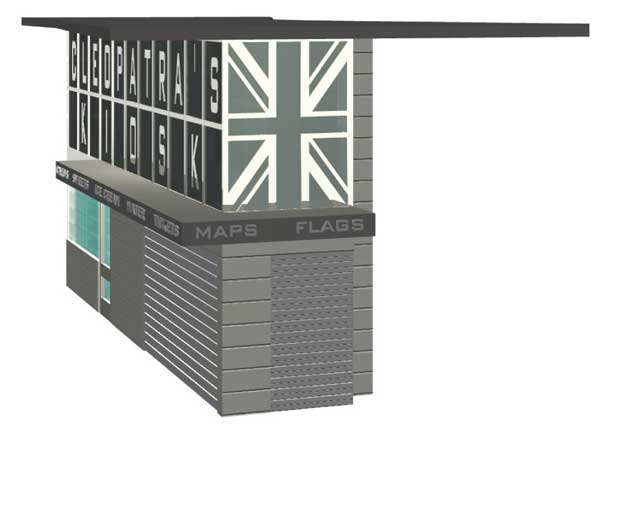 Cleopatra's Kiosk sits between the red brick Middlesex Pier of 1845 which forms the base of the North tower of Isambard Kingdom Brunel’s original footbridge, the limestone walls of the Victoria Embankment of 1864-70 and the structural expressionism of Lifshutz Davidson’s Golden Jubilee Bridge of 2002. A few minutes walk to the South is Cleopatra’s Needle, constructed by Thotmes III in c.1500 BC and erected in 1878 after being given to the British people to commemorate Nelson’s great victory at the Battle of the Nile in 1798. At the river end, Cleopatra’s Kiosk is designed to relate primarily to the Embankment walls, evoking their strong massing and lines of division; the overall linearity of the building relates to the bridge, and the use of iconography is a horizontal reference to the hieroglyphics of the Needle, relating to the inherent irony of the name "Cleopatra’s Kiosk".