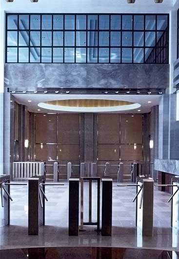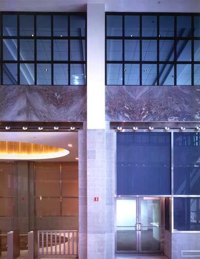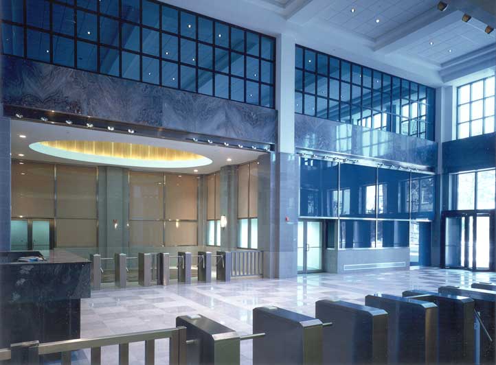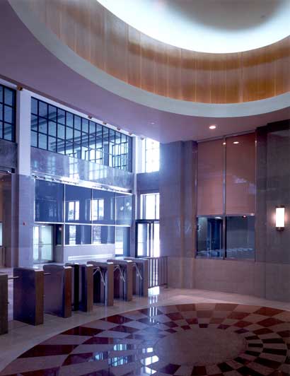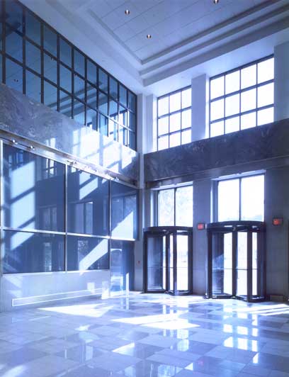 Three revolving doors lead from the street into a rectangular double-height hall. Access to the building is also provided through this hall from lower level parking areas and from the river side of the building.