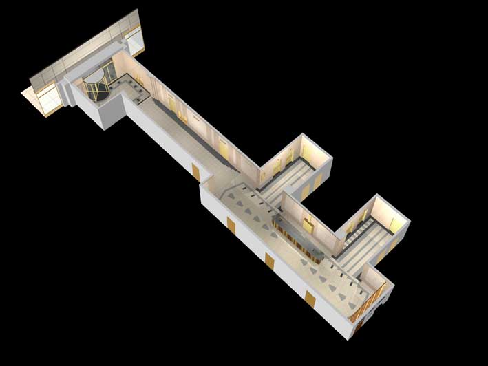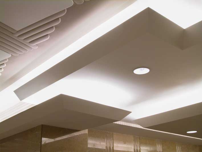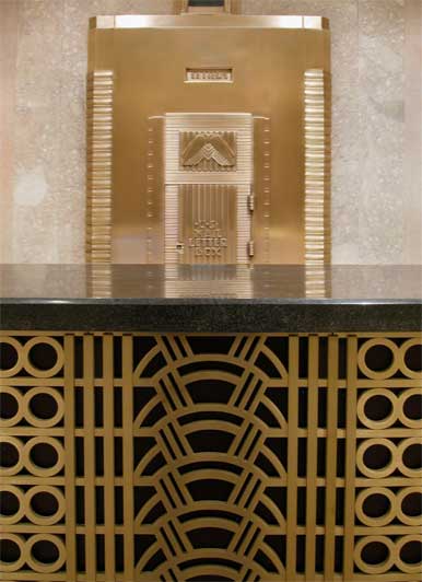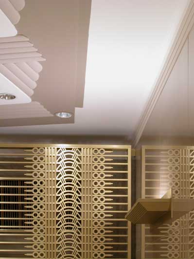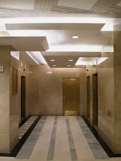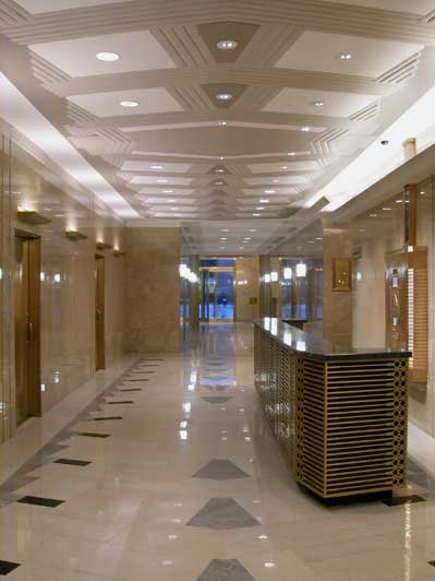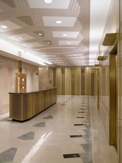 To ameliorate this difficulty, the entrance was demolished and redesigned to be far more transparent. The low plaster relief of the Art Deco ceiling was restored, illuminated and painted, and shallow dropped-ceiling planes with edge lighting were designed at the entrance and the elevator vestibule to strike a balance between historic and modern elements.