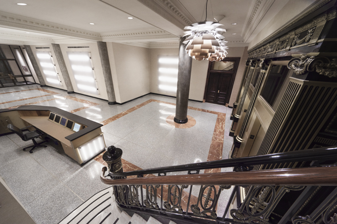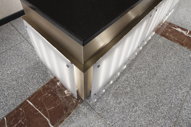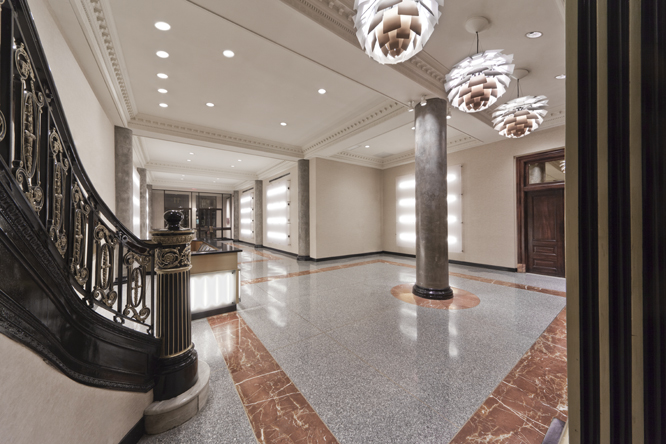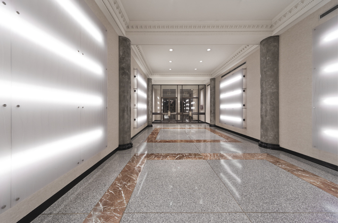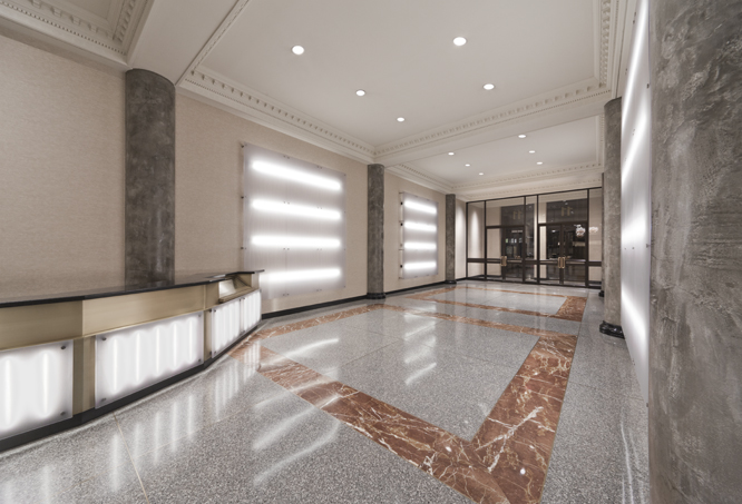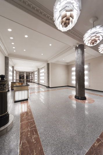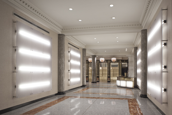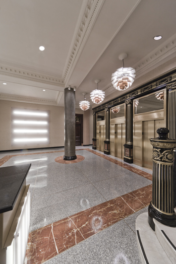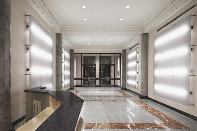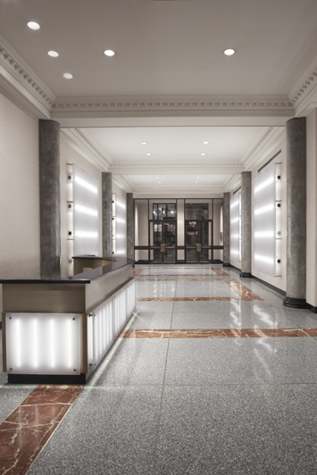 Some elements of the original design were retained, most notably the classical cast iron detailing around the elevators. The new design calls for restoring this historical material and contrasting it with modern elements, including a faceted illuminated front desk of polypropylene, granite and bronze, striated polypropylene back lit wall panels, and new lighting, security and finishes throughout.