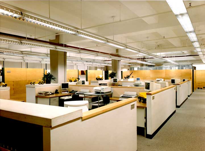 Eight foot ceilings were employed in the executive offices, conference areas and entrance vestibule to conceal mechanical systems and provide recessed lighting, but in the open central area and project manager’s offices the concrete ceiling and beams were exposed for maximum height, and the ducts, sprinklers and light fixtures are expressed. This permits semi-enclosure of the project managers’ offices by eye-height partitions, but the exposed ceiling is continuous over these areas and unites them into a single work zone, allowing natural light into the center of the plan. As a result, the plan can now be read as a U-shape enclosing a nine square work zone open at one end.