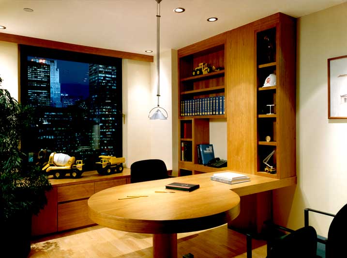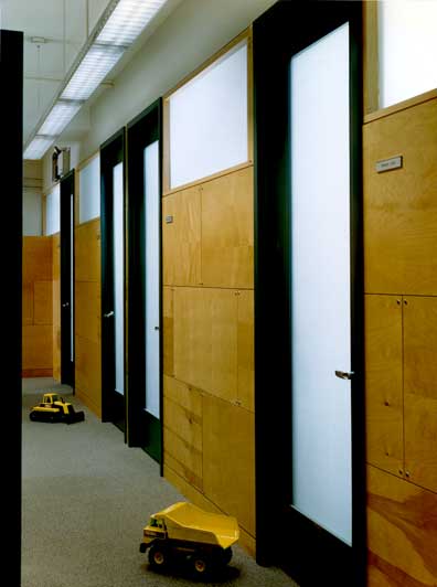 To express the identity of a construction management company, materials were chosen that are deliberately “basic”; walls are sheathed in staggered sheets of plywood, countertops are made of cast concrete and steel beams are used as fascias to desks. Executive offices are carefully distinguished as being made of “refined” materials, to express the corporate hierarchy that is represented in the plan.