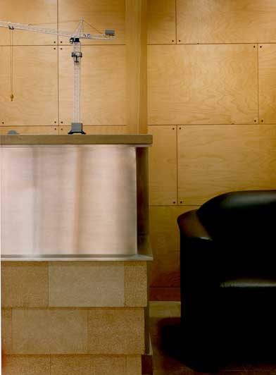 Dominating this open space is a data center made of plywood and topped (beyond arm’s length) with razor sharp un-plastered metal lath on unfinished metal studs. By its privileged position it symbolizes the preciousness of this information, and at the same time, the concurrent danger to those who gain power by possessing it.