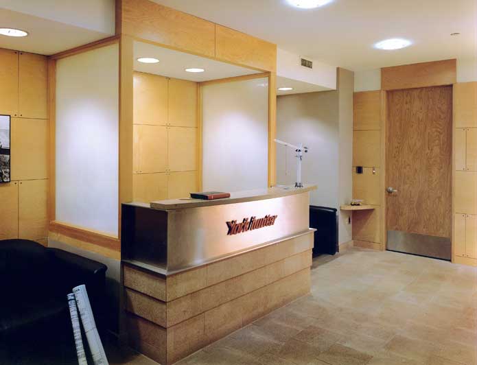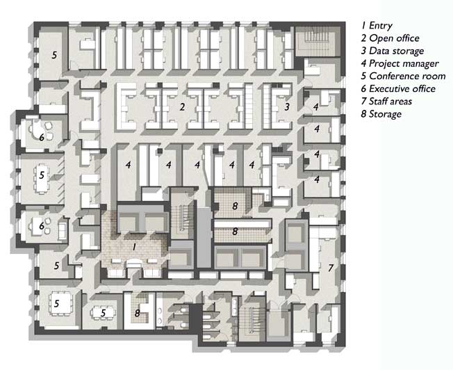 The square floor and regular twenty-five bay column grid of the York/Hunter premises, a construction management company, allowed for a concentric arrangement in which one-third of the center is occupied by the core, entrance vestibule and storage and the other two-thirds by a large open work area. Surrounding this center are perimeter offices divided in an approximately pin wheel formation. Reading clockwise from the elevator vestibule in the core area there are: an executive wing, a project manager’s wing, an information technology and data storage wing and a conference and marketing wing, in which the bathroom facilities are also located. The open work area is adjacent to the project managers and I.T. wing, so that flexible work teams can be created for projects of varying size and durations.