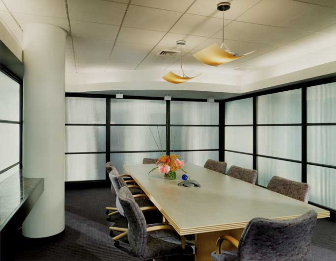 The large conference room is made of striated glass walls so that a conference event can be observed as an abstraction from the internal street and from the reception area. Smaller meeting areas are planned to be deliberately open in design with large sliding glass doors and glass slots in the walls so that spontaneous discussion will be promoted.