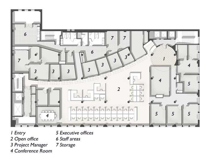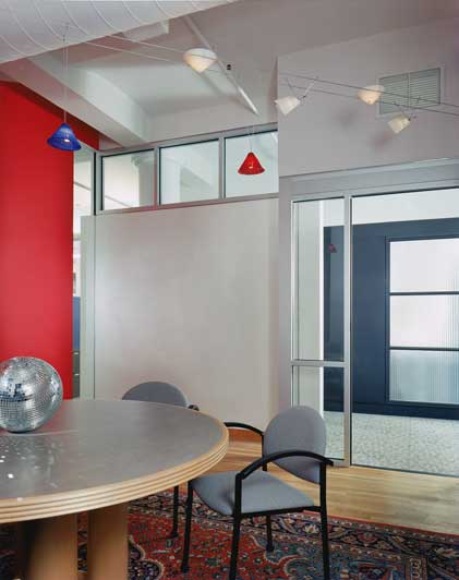 Since the purpose of the company is to provide event services to large corporations, a gestural, purposefully “eventful” form was introduced into the plan, linking the two ends. This curvilinear form consists of glass-fronted project manager’s offices arranged in a spine that forms a “street” through the space terminating at the far end in an art director’s office, and at the elevator end in a circular reception area and front desk.