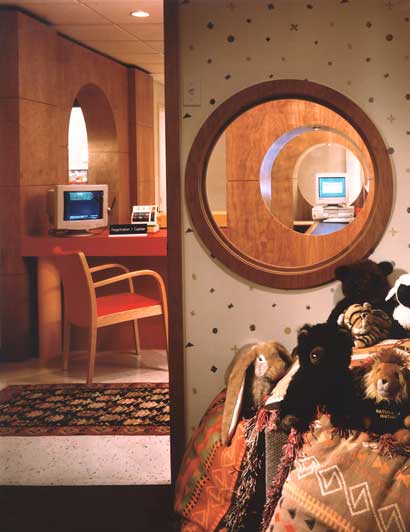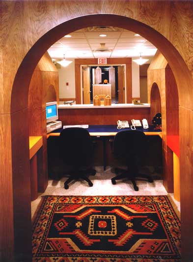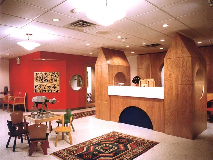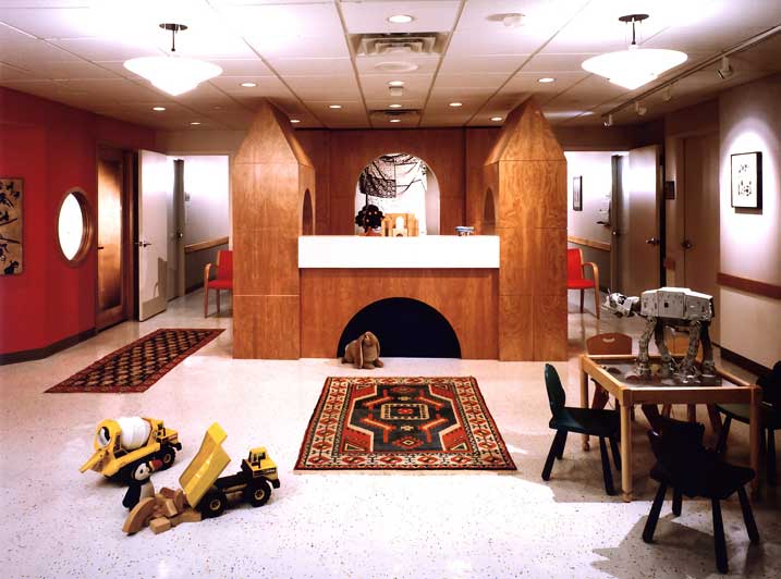 An existing ground floor medical facility was gutted and renovated to create a pediatric otorhinolaryngology clinic for three doctors and their staff. The atmosphere of the facility was required to be non-threatening for children, and was designed with this requirement in mind. An intimidating institutional environment was avoided by introducing bright colors and forms derived from children’s toy blocks.
