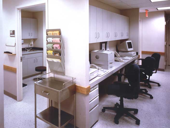 Programatically, the facility contains three consultation rooms, four exam rooms, billing, reception, waiting, medical records area, bathroom and shower facilities as well as a staff lounge.