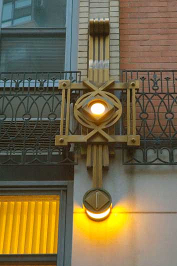This horizontal line is reinforced with an arrangement of variegated marble panels at the 2nd floor level. The limestone piers are also articulated with urban scaled decorative bronze light fixtures. These are designed to appear as though they could slide up and down the existing piers, visually connected to the decorative horizontal band of railing in the manner of the Bayard Building, Louis Sullivan’s only work in New York. These elements add a rhythm to the building that is related to the scale of a pedestrian and which create an intimacy to the building quite missing from the original, especially in the evening.