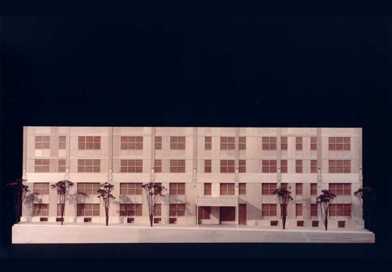 The idea of the variegated marble panels is derived from Romanesque monastery cloisters, in which the columns supporting the roof of the perimeter ambulatory are individuated, frequently by the use of different marbles. The intent is to give to the space of the street a similar meditative character, so that the inquisitive passerby may reflect on the nature of the individual, the city and its buildings.