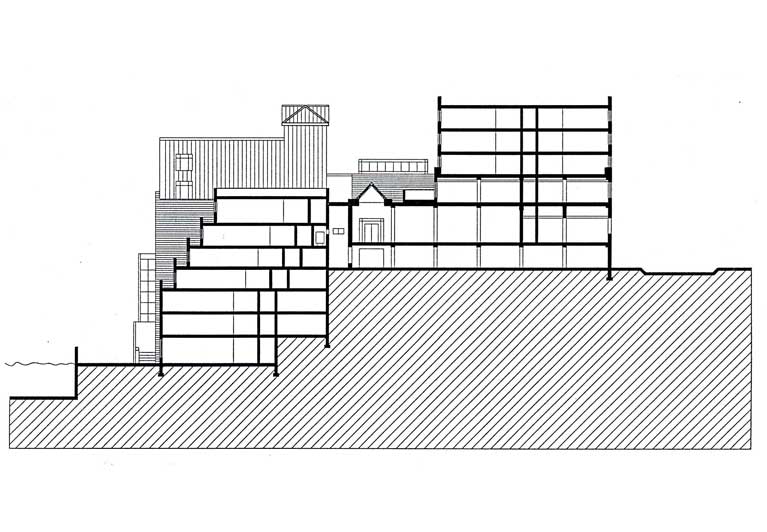 The hotel follows the slope of the hill, overlooking the Rondout Canal. The housing and retail components of the project are located at the top of the slope adjacent to an existing urban area. Parking is provided both under the building, in the original basement of the plant and in terraced parking spreading down the hill. The bulkhead would be developed to take advantage of the considerable boat traffic on the Creek, which connects directly into the Hudson River.