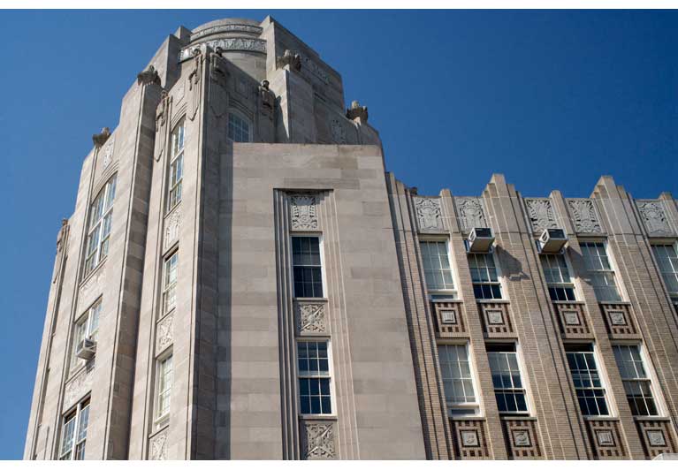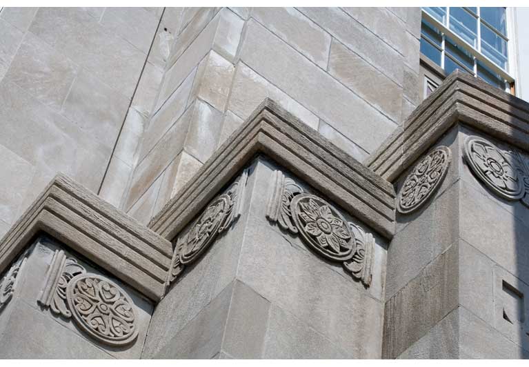 The exterior of the building on the street facades was composed of dimensional limestone, varying between 4 and 8 inches in thickness. Due to rusting of the interior steel structure, many vertical cracks had begun to appear, especially in the tower and rotunda element at the main entrance. The limestone blocks forming the four corners of the tower and rotunda at the steel framing were removed the full height of the building, new matching dimensional limestone was quarried, and the stones were replaced.