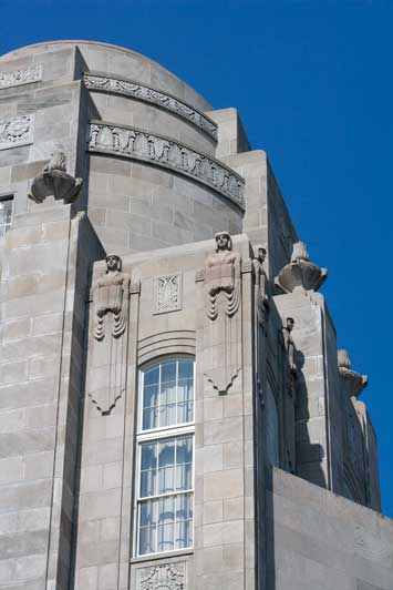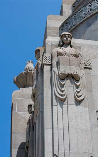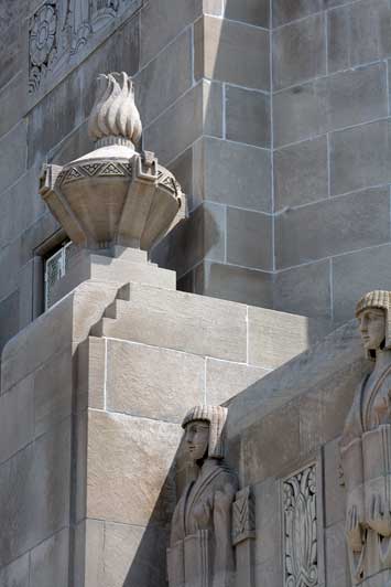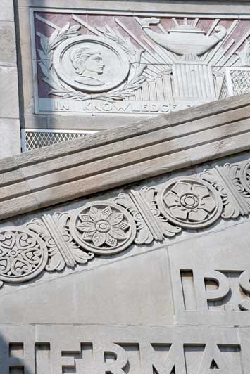 Many areas of limestone on the other facades and at the rotunda were chipped or had other surface damage; these areas were repaired in place, and the entire rotunda was re-pointed. Special attention was given to the rotunda’s limestone sculptures of flaming urns and monumental robed figures presenting open books to the four point of the compass. These elements required very careful repair.  As well, the rotunda roofs were replaced to prevent interior leaks.