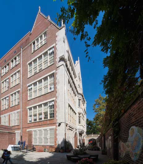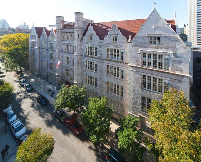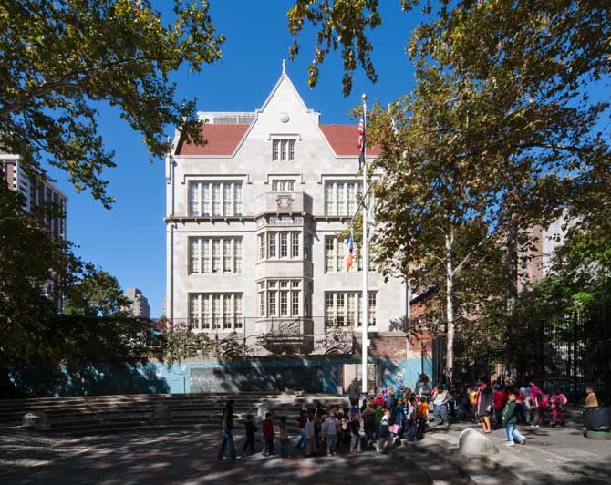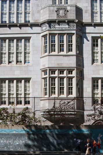 PS 166M is located at 132 West 89th Street, New York, NY and was erected in 1898 according to the design of C.B.J. Snyder in a “Collegiate” Gothic Style. The five story building is vertically composed of beige limestone base on granite water table, light beige terra cotta on three façades, and red brick on the back elevation. The building has elaborate ornamental gables and red tile roofing, cast terra cotta stringcourses and cornices running around three sides of the building and deeply molded window headers on the upper floors.