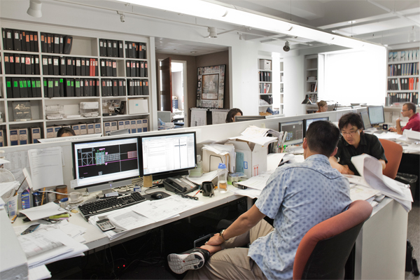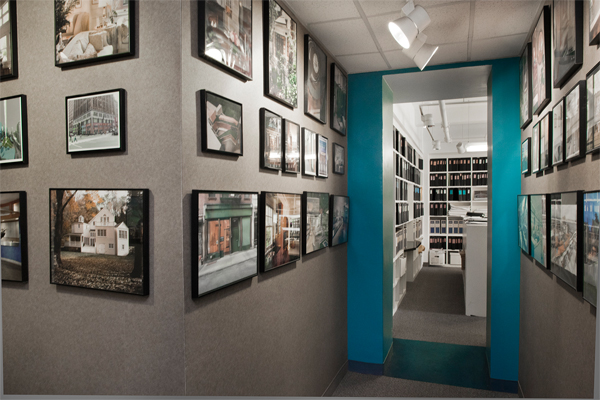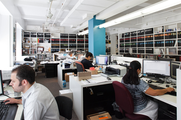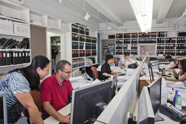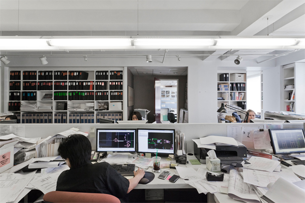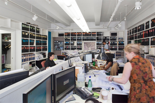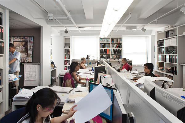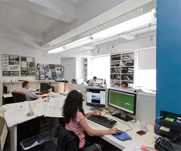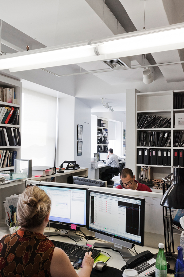 Macrae-Gibson Architects is a 15-person firm located on the 24th floor of Nelson Tower, at 450 7th Avenue in mid-town Manhattan. The offices occupy 2,600 square feet of space arranged in two connected open work areas with related entry gallery, conference, storage and digital support spaces. The office receives abundant natural light which illuminates its tall, exposed-ceiling interior.